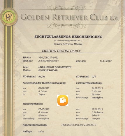Darcy hat am 09. März 2020 die Zuchtzulassungs-Bescheinigung vom GRC erhalten.