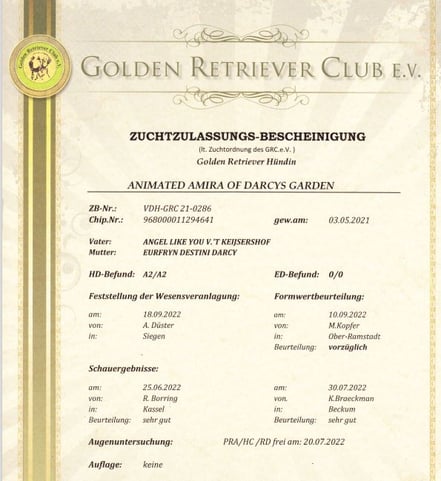 Amira hat am 29. November 2022 die Zuchtzulassungs-Bescheinigung vom GRC erhalten.